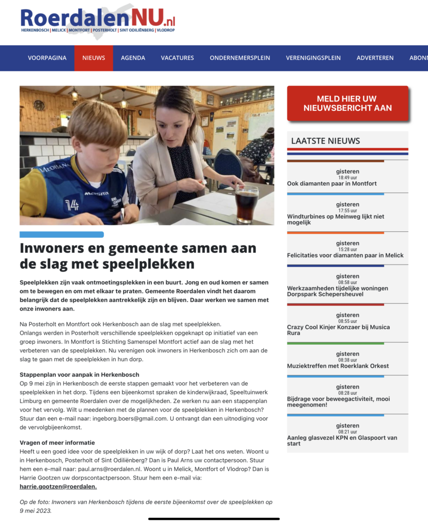 Spelen is belangrijk, voor jong en oud! Daarom staan speelplekken in de top-3 van alle dorpen in Roerdalen. Maar wij vinden dat niet alleen: ook ouderen vinden het belangrijk! Daarom werken zij samen met ons aan het verbeteren van de speelplekken in de dorpen. Je kunt er alles over lezen op roerdalennu.nl
